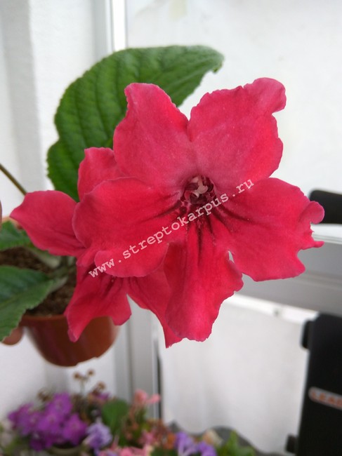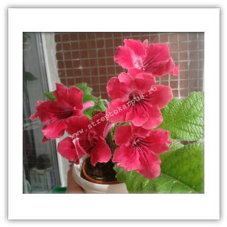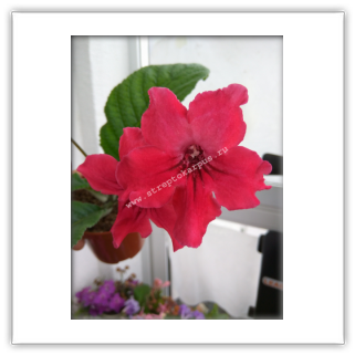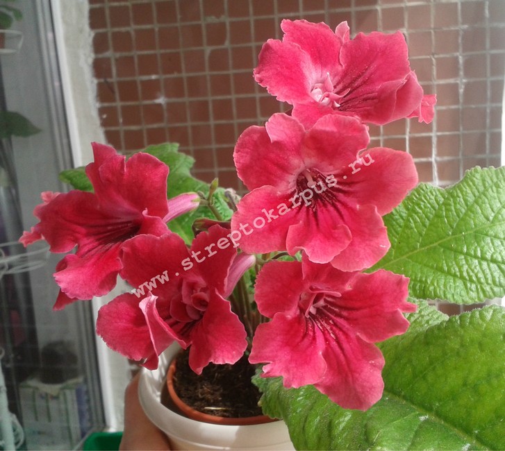 Простые и полумахровые цветы тёмно-розового цвета. Из горла на нижние лепестки выходят бардовые лучики. Розетка крупная.