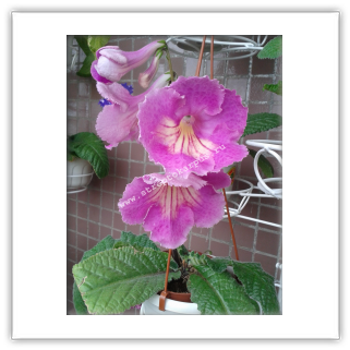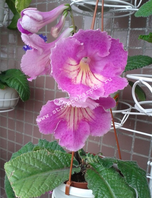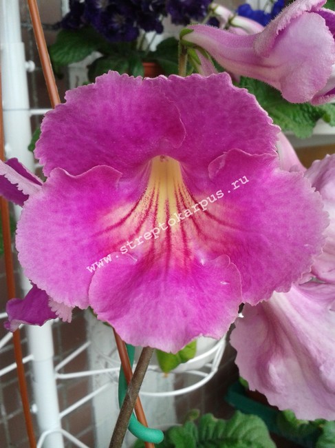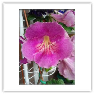 Огромные пурпурно-розовые чуть пятнистые с желто-оранжевым горлом и выходящими из него бардовыми лучами цветы на мощных длинных цветоносах. Лепестки плотные с резными краями. Розетка крупная, листья жесткие.